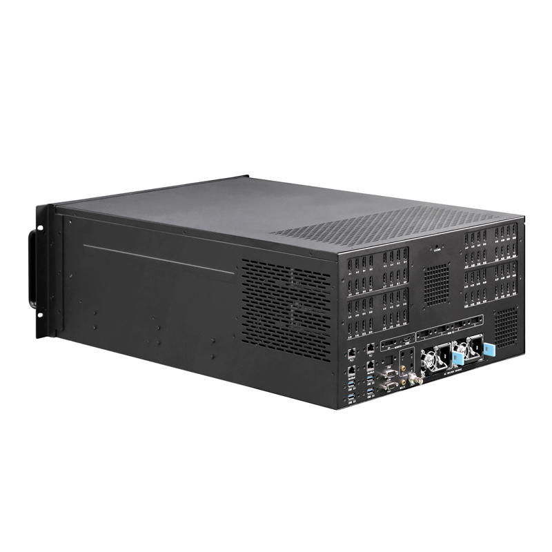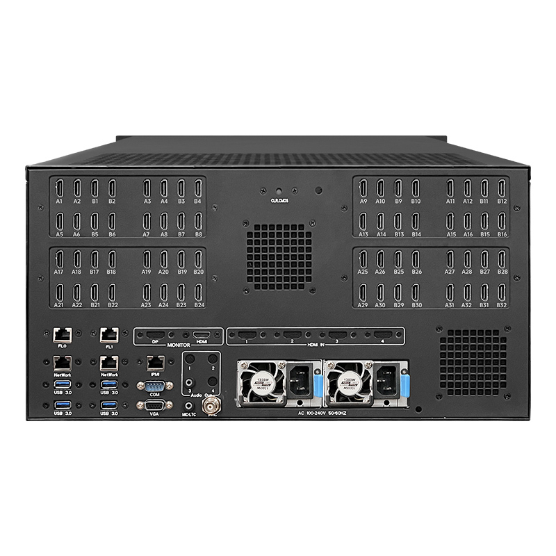 深工SG-C32-FHD超高分服务器是瑞众科技最新推出的16K*16K超高分辨率下的点对点渲染服务器,通过超高图形工作站配置并进行暴力散热系统适配,满足了28311万像素点(32*4096*2160)超高分辨率下视频播放需求 。深工SG-C32-FHD具备32路HDMI2.0的4K输出信号,同提供32路HDMI2.0同步备份输出信号,适用于显示屏环路备份信号需求,适用于超大分辨率下全屏返看及以复制模式同步操作前端的本地运维需求,适用于局域网及广域网环境下全屏预监的远程运维需求。深工SG-C32-FHD搭载VMEET E3媒体播控系统软件旗舰版,全兼容常规H.264、H.265、HAP视频编码格式,支持全景摄像头及全景视频播控,支持三维模型导入及三维场景仿真预览。SG-C32-FHD搭载VMEET E3媒体播控系统软件旗舰版,支持可视化媒体管理和节目编排及渲染切片、虚拟屏输出拆分重组功能,支持按屏幕分辨率和模组分辨率进行网格生成,可实时修改参数调校网格,适用于LED隧道屏、多折幕、柱幕、球幕快速校正对齐,满足了多屏空间融合、沉浸式CAVE融合、裸眼3D及其它超大分辨率下创意显示的播控需求。